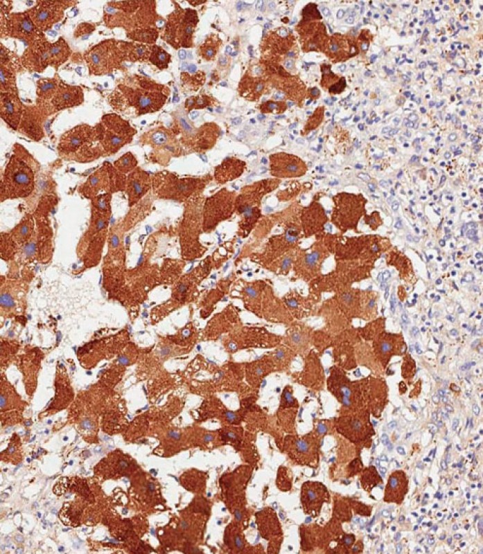 Immunohistochemical analysis of paraffin-embedded Human hepatocarcinoma tissue using P34735 performed on the Leica® BOND RXm. Tissue was fixed with formaldehyde at room temperature, antigen retrieval was by heat mediation with a EDTA buffer (pH9. 0). Samples were incubated with primary antibody(1:500) for 1 hours at room temperature. A undiluted biotinylated CRF Anti-Polyvalent HRP Polymer antibody was used as the secondary antibody.
